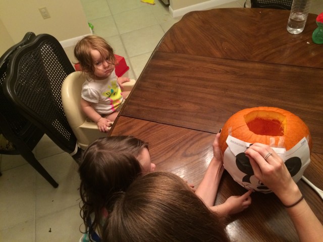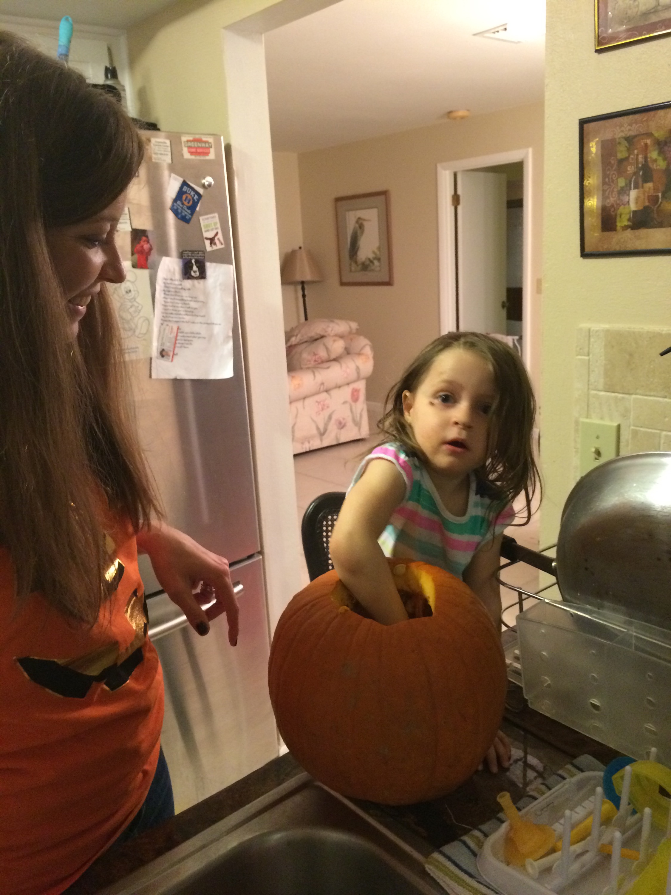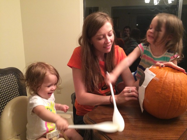 Kendall clearing out the insides of the pumpkin.