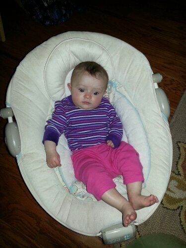 Baby waiting patiently for Mom and Dad to finish getting ready so she can go play.